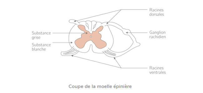 La moelle épinière appartient donc au système nerveux central car elle est le prolongement du cerveau au niveau des vertèbres. Dans cette moelle épinière, il est possible de discerner deux structures différentes, la substance grise et la substance blanche. La substance grise est composée des corps cellulaires des neurones alors que la substance blanche est constituée des axones, partie centrale des neurones.